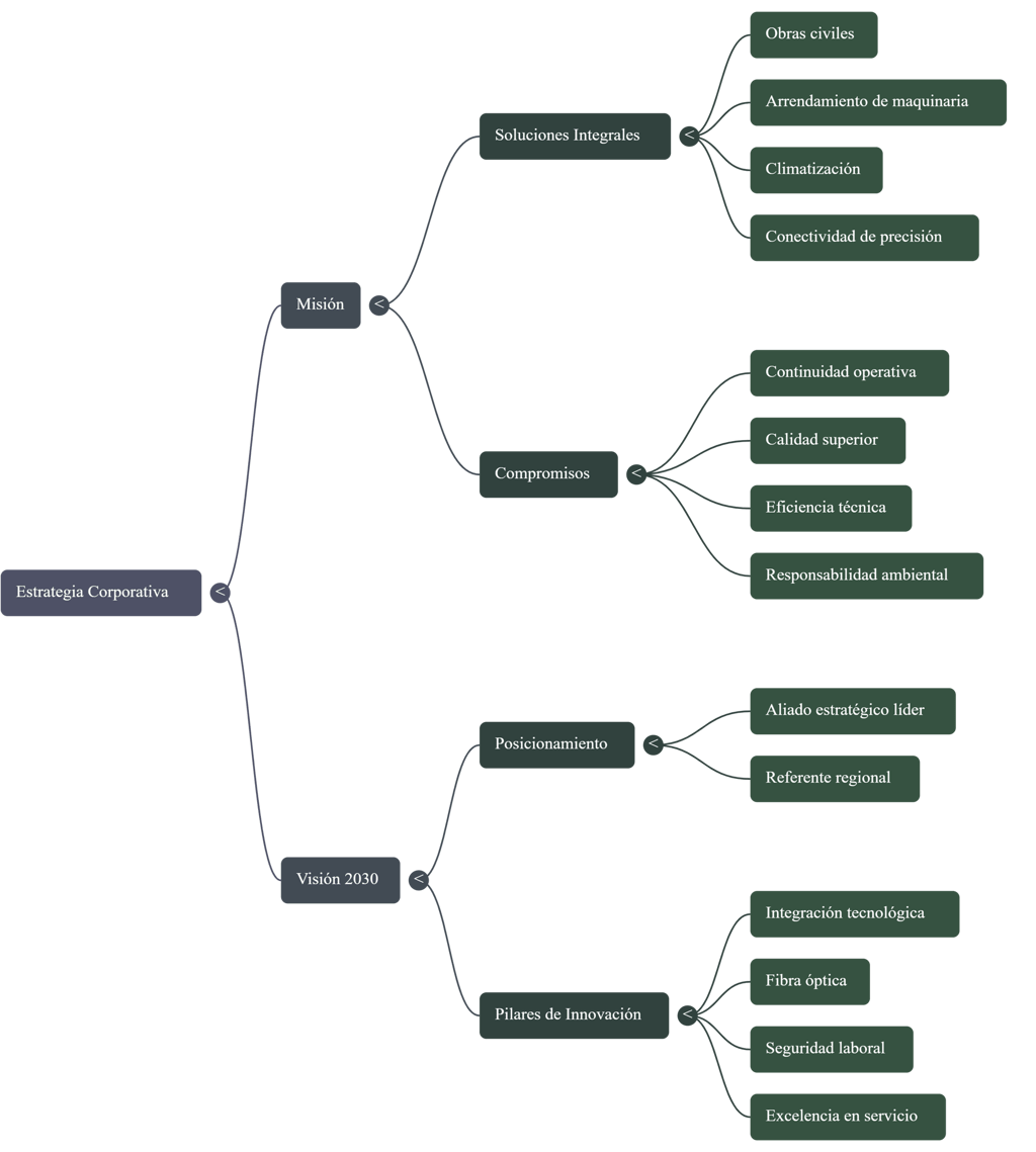 Proveer soluciones integrales en infraestructura y tecnología, mediante la ejecución de obras civiles, el arrendamiento de maquinaria especializada y la instalación de sistemas de climatización y conectividad de alta precisión. Nuestro compromiso es garantizar la continuidad operativa de nuestros clientes con estándares de calidad superior, eficiencia técnica y responsabilidad ambiental.